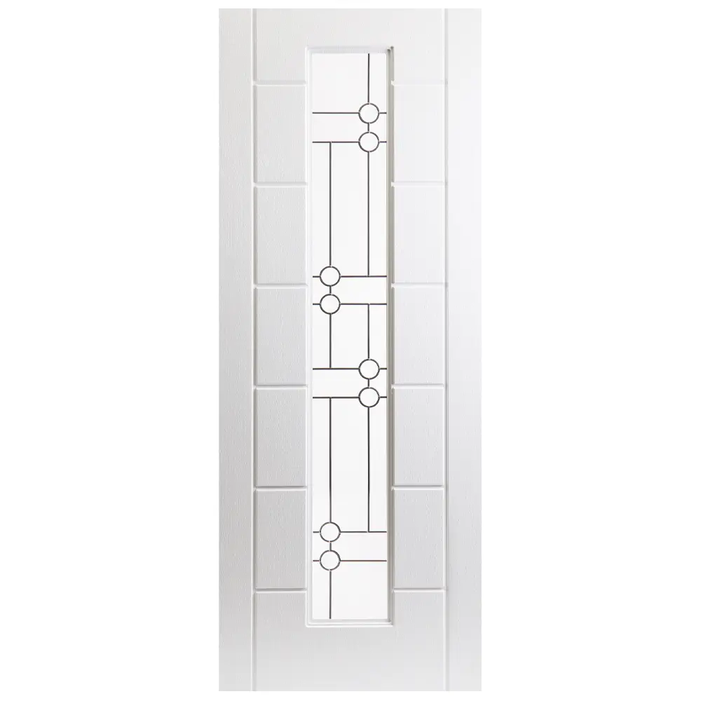 Striking vertical glazed panel with circular accents. Maintenance-free UPVC, toughened safety glass. Sizes: Width 705-864mm, Height 1880-2070mm.