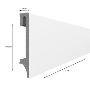 The White ESP401 skirting boards are 2400mm in length, 100mm tall and have a depth of 16mm.